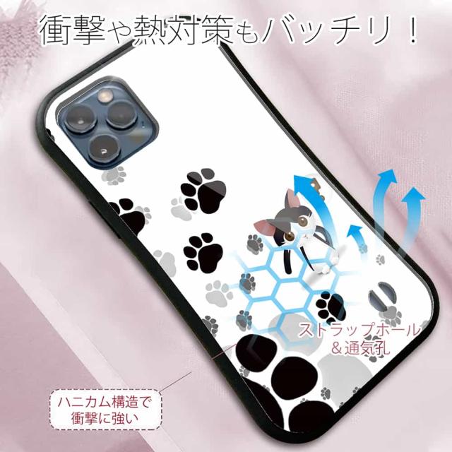 | 商品説明 | 落下や衝撃に強いTPUケース+綺麗に印刷できるアクリル板でプリント。誰の足跡? ネコ好きにオススメのデザインです! |