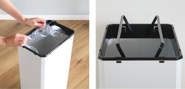 本体内側には、ゴミ袋を装着しやすい袋止めが付いています。ゴミ袋が外から見えないようにセットでき、取り付けも簡単です。蓋枠などには再生ポリプロピレン100%を使い、環境に優しい素材です。