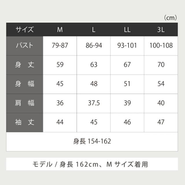 ■サイズ:身長154-162、M/バスト79-87、身丈59、身幅45、肩幅36、袖丈44、L/バスト86-94、身丈63、身幅48、肩幅37.5、袖丈45、LL/バスト93-101、身丈67、身幅51、肩幅39、袖丈46、3L/バスト100-108、身丈70、身幅54、肩幅40、袖丈47cm。モデル/身長162cm、Mサイズ着用。