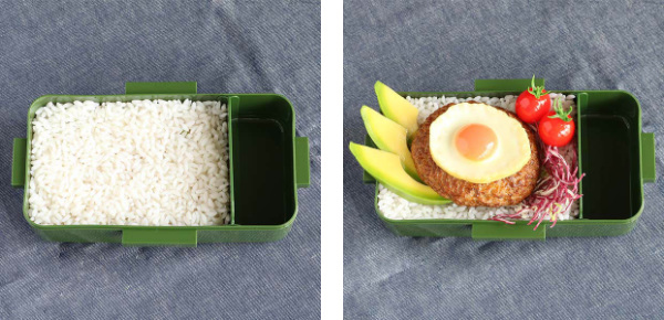 ドーム型の蓋になっているので、鮭やカツなどの大きなおかずをのせても潰さずきれいに盛り付けができます。蓋にソースやふりかけが付きにくく、きれいな状態のままで食べれます。