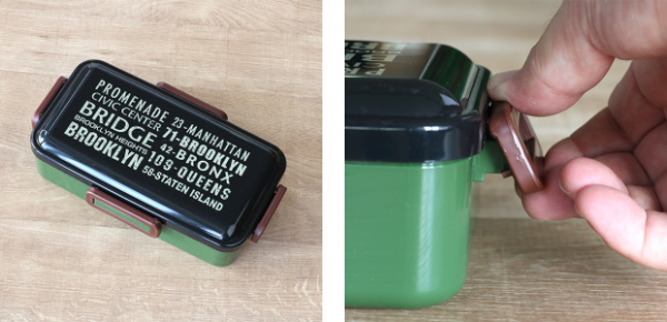 蓋裏のパッキンと4点ロックでしっかり固定できるので、汁漏れしにくく、持ち運ぶ時も安心です。閉める時もカチッと音がするので閉め忘れがありません。