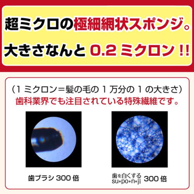 | 商品説明 | ●研磨剤・薬品類を一切使用していません。 ●水を浸けて軽くこするだけでステイン・汚れ簡単除去 ●特殊加工のメラミンスポンジが歯ブラシでは落としきれない歯の表面の超微細な溝に詰まった汚れも効果的に除去して歯本来の色に! ●歯のエナメル質の表面を傷つけずに汚れを落とすクリーナーです。 ●超ミクロの極細毛状スポンジ、メラミンフォーム。その大きさわずか0.2ミクロン(1ミクロン=髪の毛の1/10000) ●コーヒー、ワイン、タバコ、黄ばみ汚れが気になる方に ●一般ユーザー様のご利用はもちろん、ホテル・旅館・民泊の業務用としても広くご愛用頂いております。 |