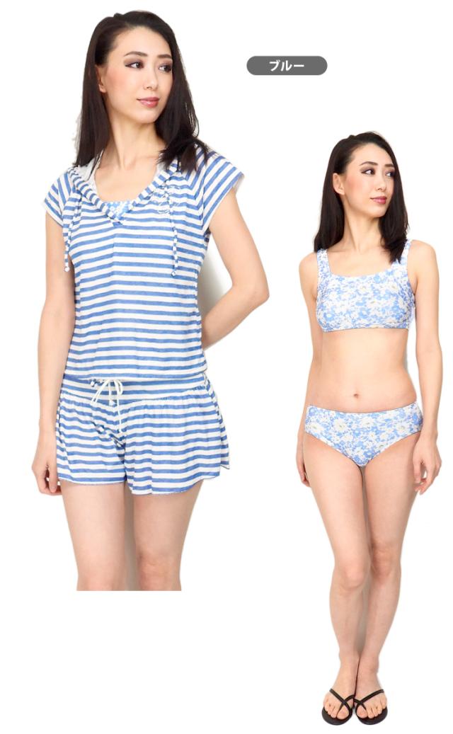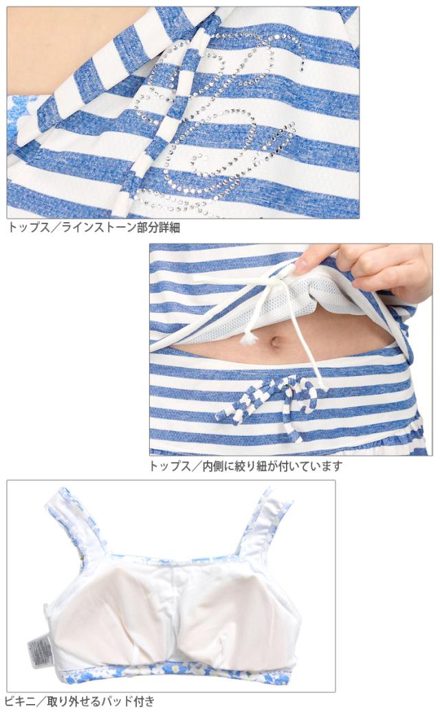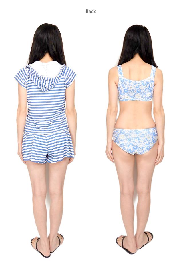 ボーダー柄パーカーと花柄ビキニの組み合わせがカジュアルでかわいいデザインです。