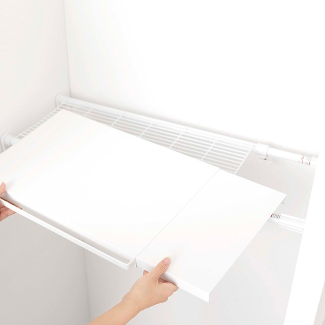 つっぱり棒に乗せるだけで棚が完成! 伸縮式なので使いたい幅に合わせて設置できます。