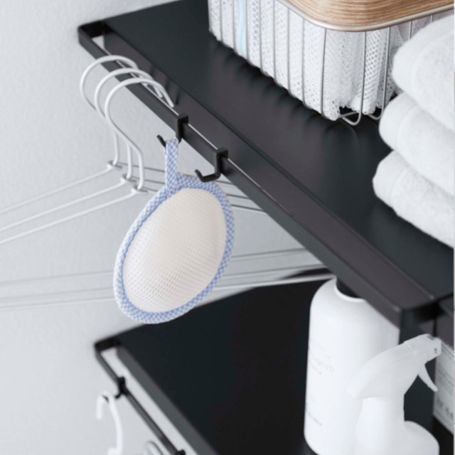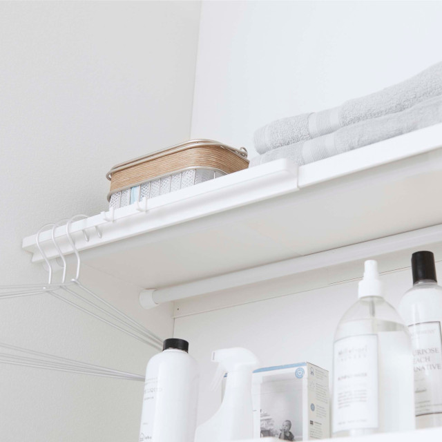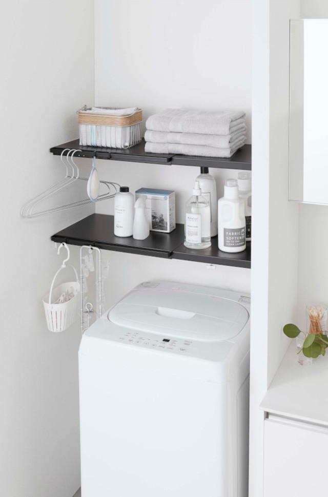 つっぱり棒に乗せるだけで棚が完成! 伸縮式なので使いたい幅に合わせて設置できます。