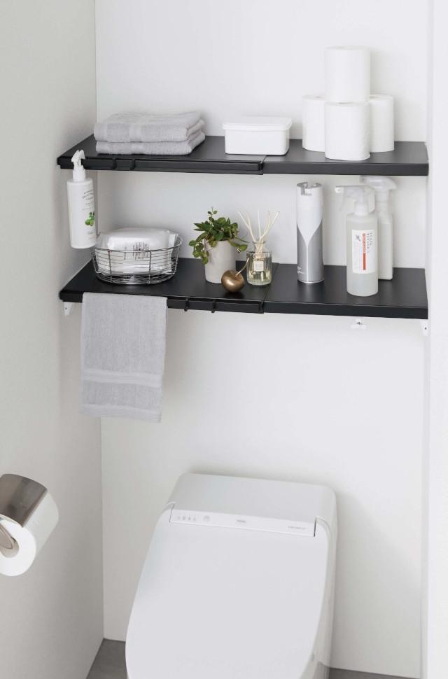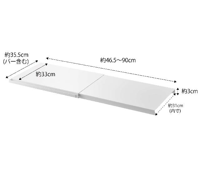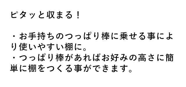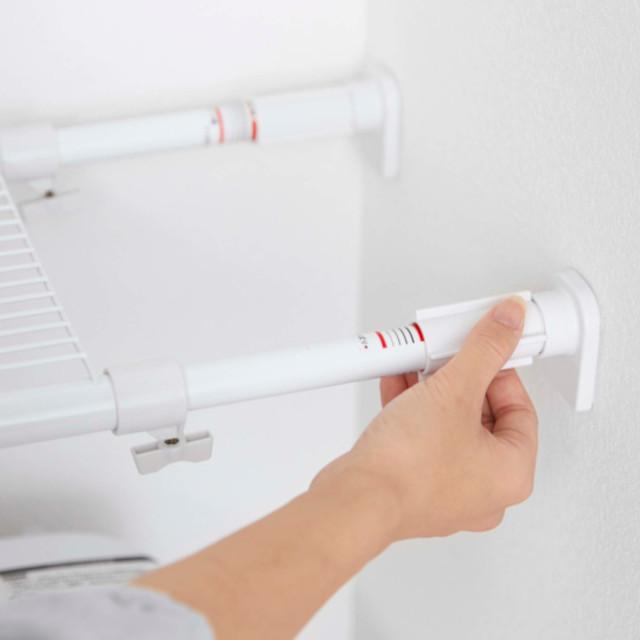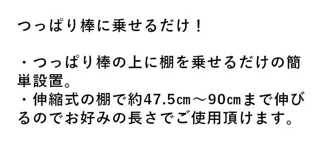つっぱり棒に乗せるだけで棚が完成! 伸縮式なので使いたい幅に合わせて設置できます。 |