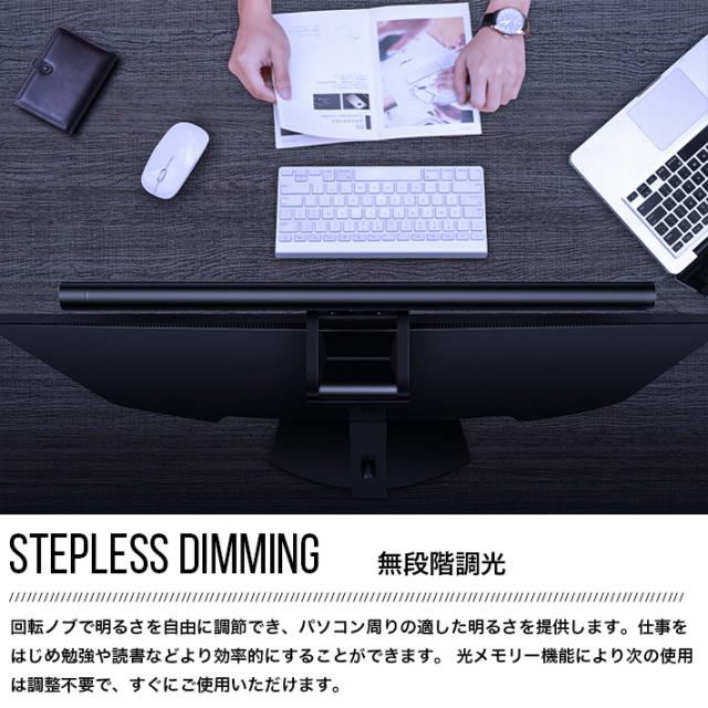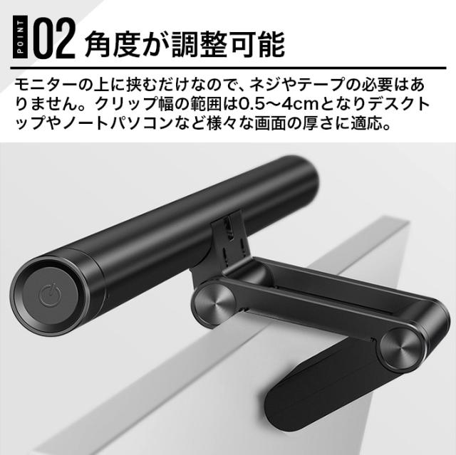 【無段階調光&3種類色温度】回転ノブは明るさを自由に調節でき、異なる環境の人の明るさに対する需要を満たす。三種類の照明モードが、ワンタッチで 切り替わります。色温度は2900K暖かい光、4000K混合光及び5000Kホワイト光としてお好みで選ぶことができ、仕事や勉強をより効率的にする ことができます。 光メモリー機能により、次の使用は調整不要で、すぐに開けます。 【角度が調整可能】重力回転軸固定装置を採用し、スクリーンの厚さに合わせ て、重力ベースを適切な角度に調整して直接スクリーンに掛け、簡単に固定できます。 製品をコンピュータ画面の上にクリップするだけで、ネジやテープは必要ありません。 クリップ範囲は0.5〜4cmで異なる画面の厚さに適用します。 優れたUSB読書灯は、ほぼすべてのモニターに適合します。