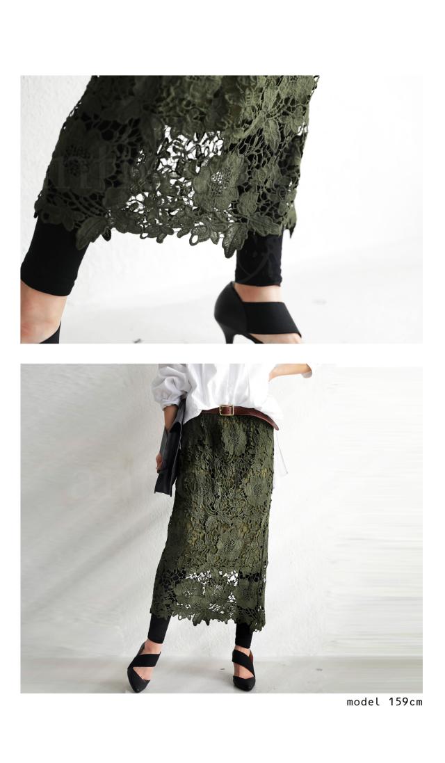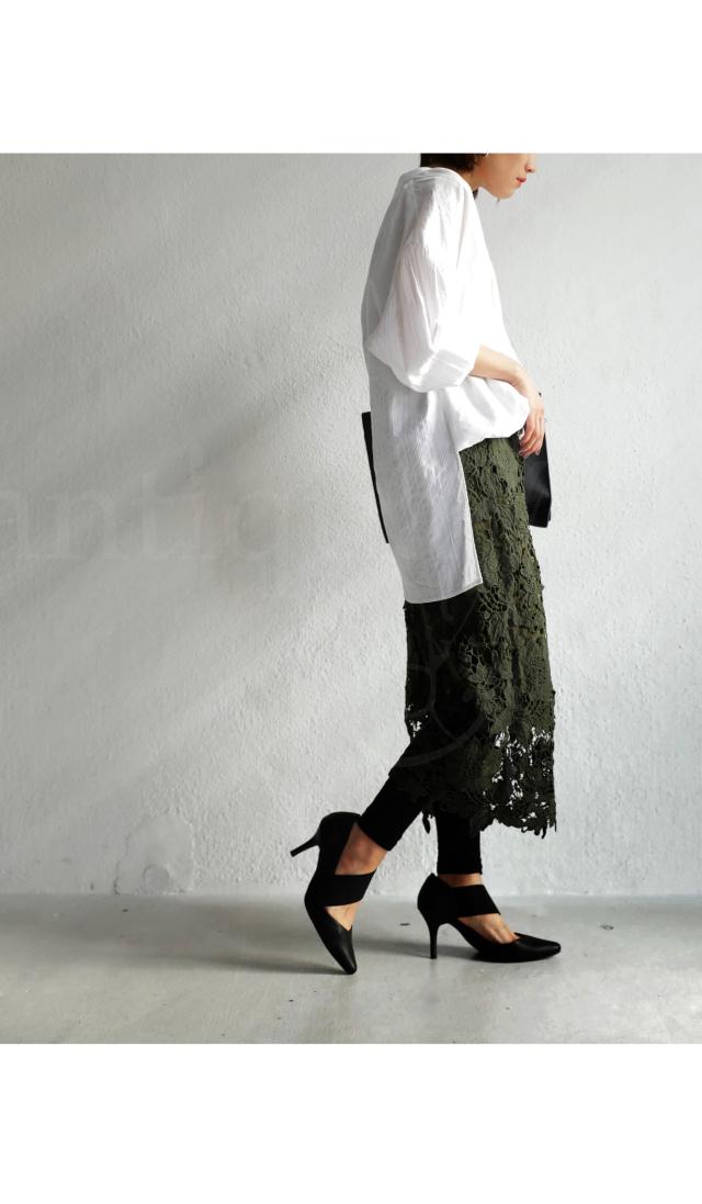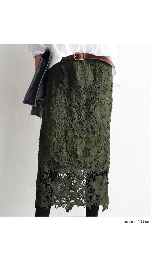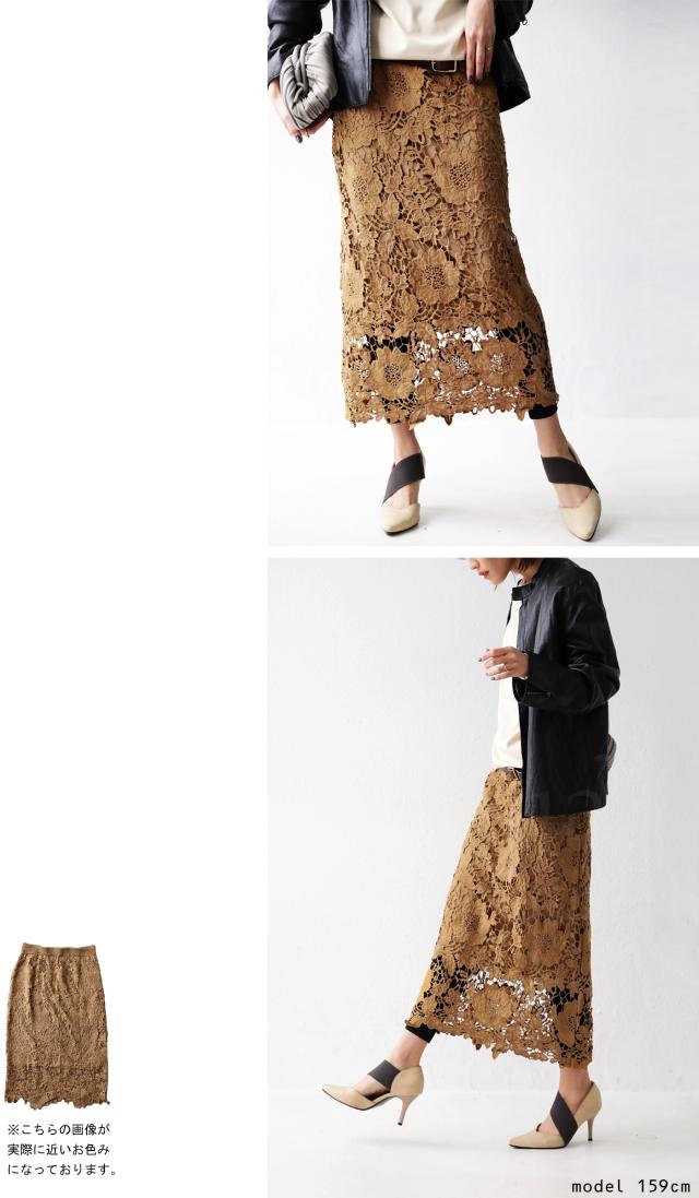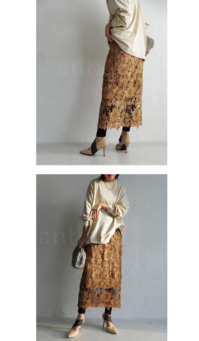 - カーキ色を購入しました。レース生地は厚みがあり、しっかりした印象で、高見えします。ウエストは幅広のゴムに編み込みデザインが施されているため、そのまま見せても恥ずかしくない?? 色違いのベージュも購入しようかな。 足さばきに関して、スリットになっているとより良いと感じたため、評価は星四つにさせていただきます。