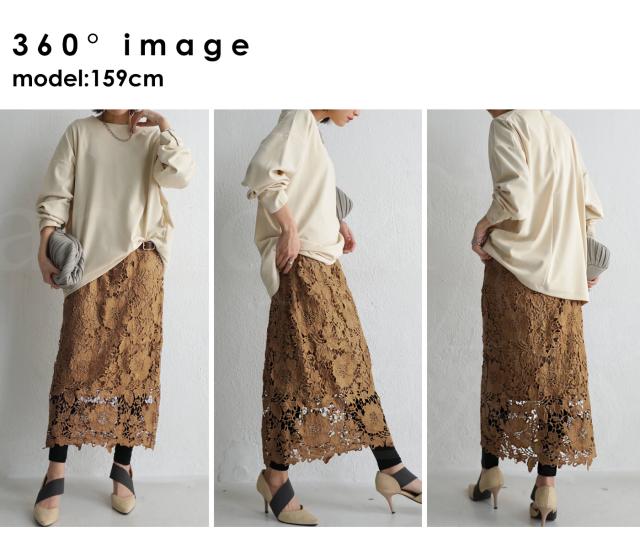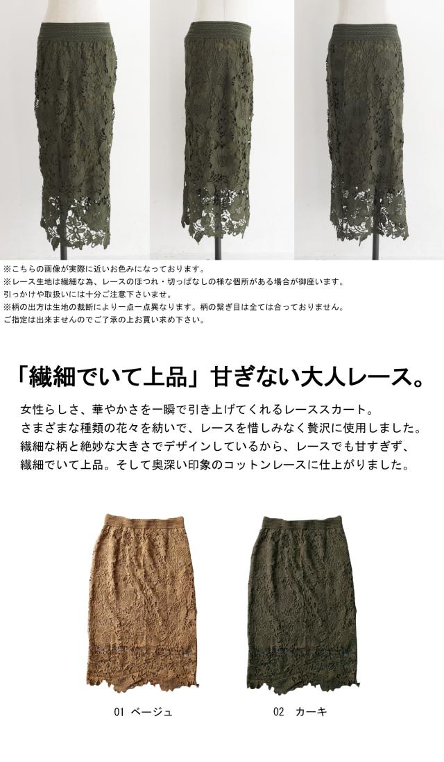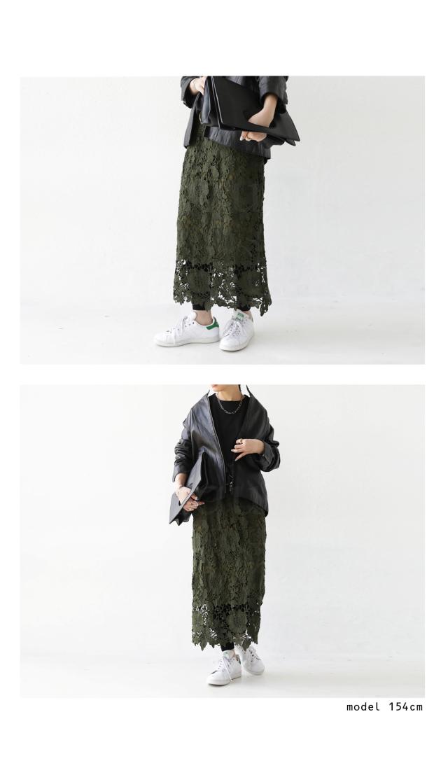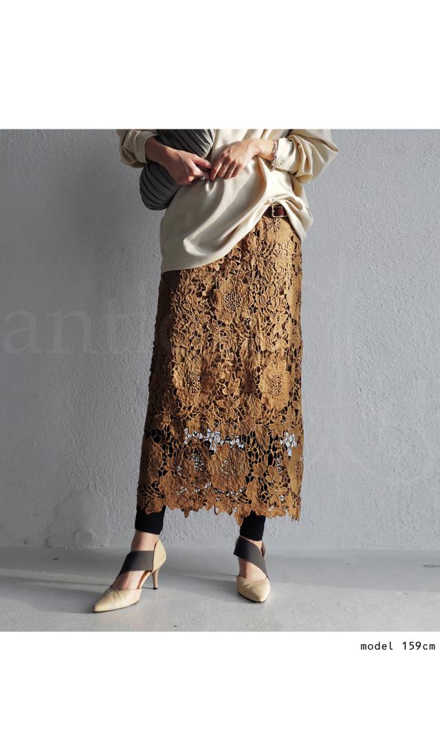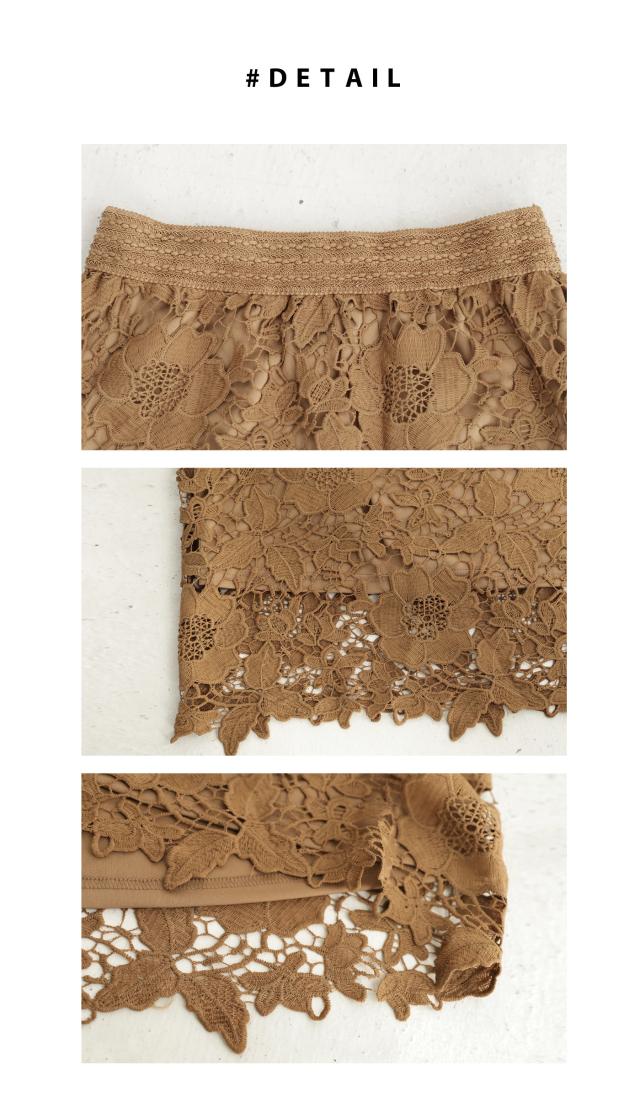 - カーキ色を購入しました。レース生地は厚みがあり、しっかりした印象で、高見えします。ウエストは幅広のゴムに編み込みデザインが施されているため、そのまま見せても恥ずかしくない?? 色違いのベージュも購入しようかな。 足さばきに関して、スリットになっているとより良いと感じたため、評価は星四つにさせていただきます。