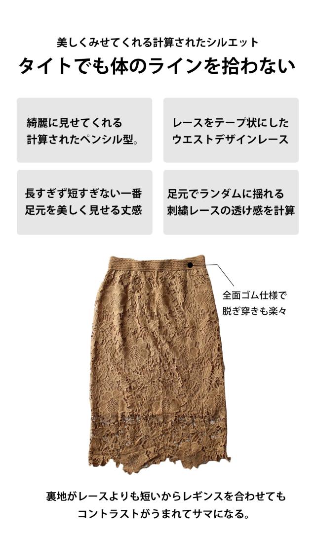 YA-00340 レース タイト 上品 フェミニン ペンシル型 クロシェ 刺繍 ミモレ丈 総レース 裏地付き ウエストゴム フォーマル 結婚式 二次会 パーティー