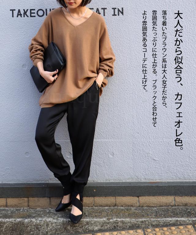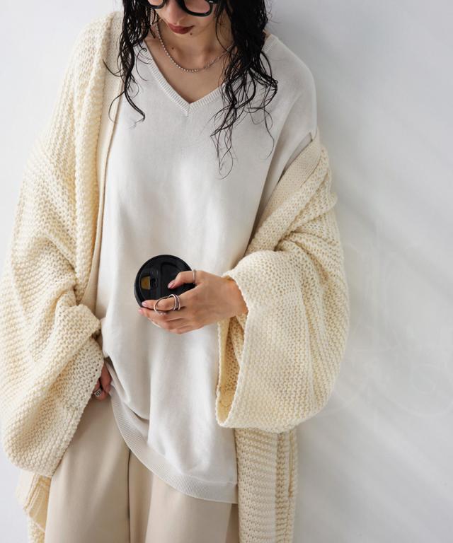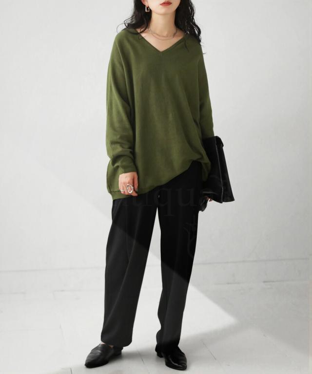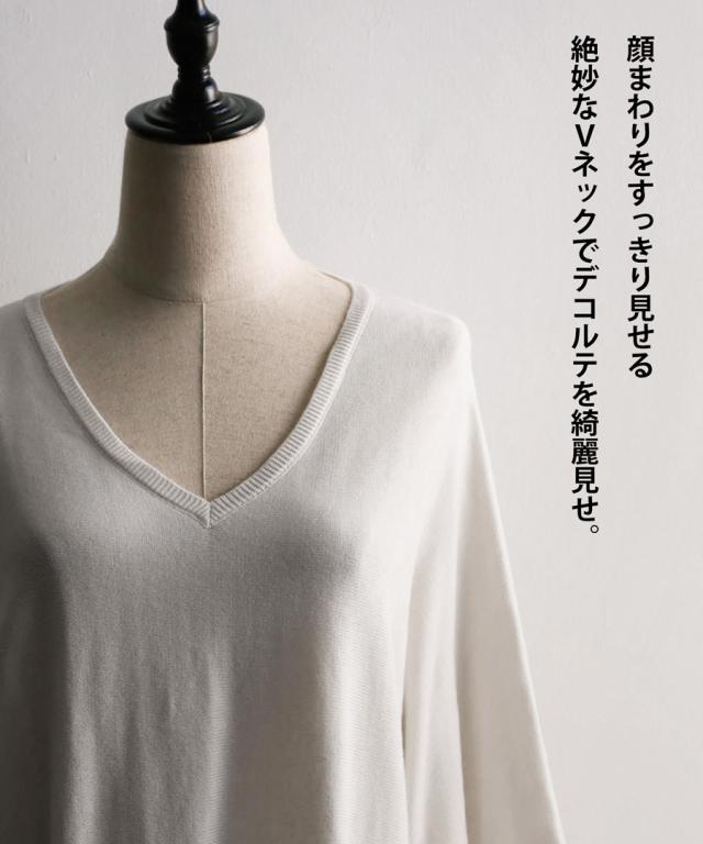 肩を落としたシルエットはゆるさと華奢見せを叶えてくれ、すっきりとデコルテを綺麗魅せしてくれるVネックニット。
