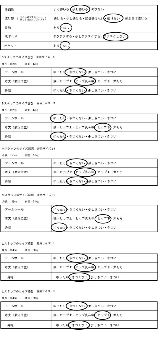 | ※平置き採寸です。サイズは目安にご参考下さいませ。 ※素材の特性上、平置き採寸のサイズと実際の着用サイズとは異なります。サイズ表から±3cm差がある場合がございますので着用イメージは画像をご確認いただき、ご了承の上、お買い求めくださいませ。 |