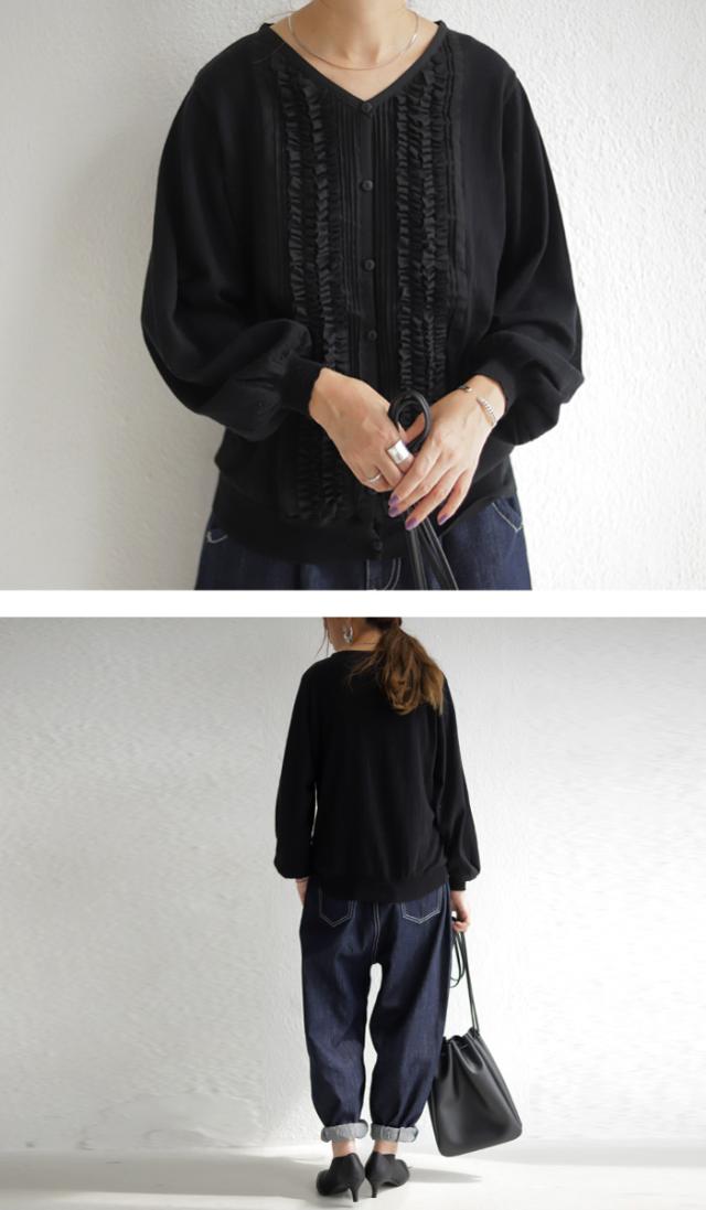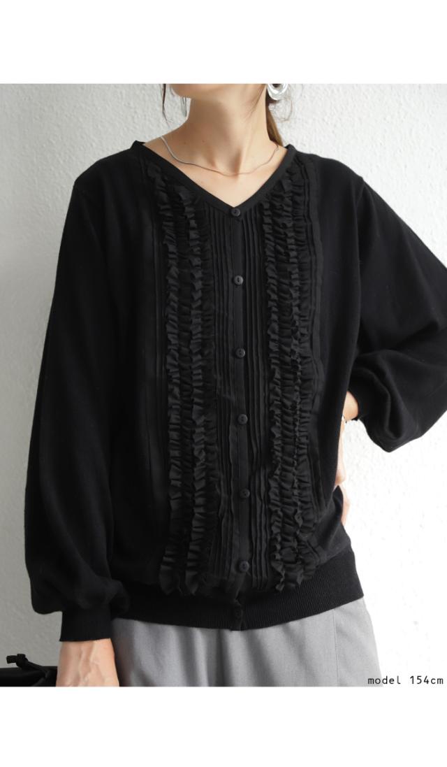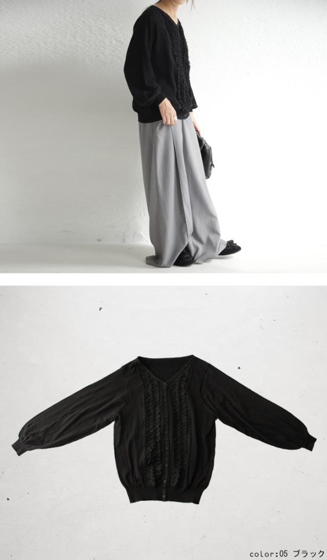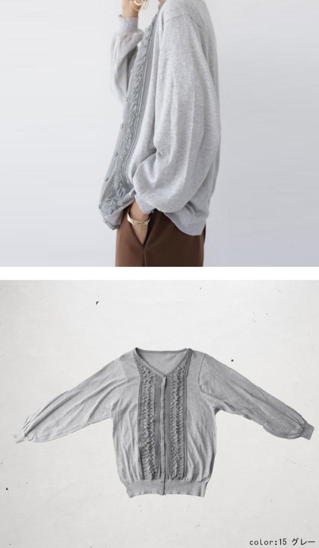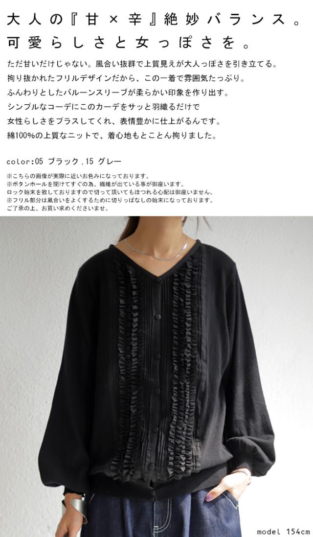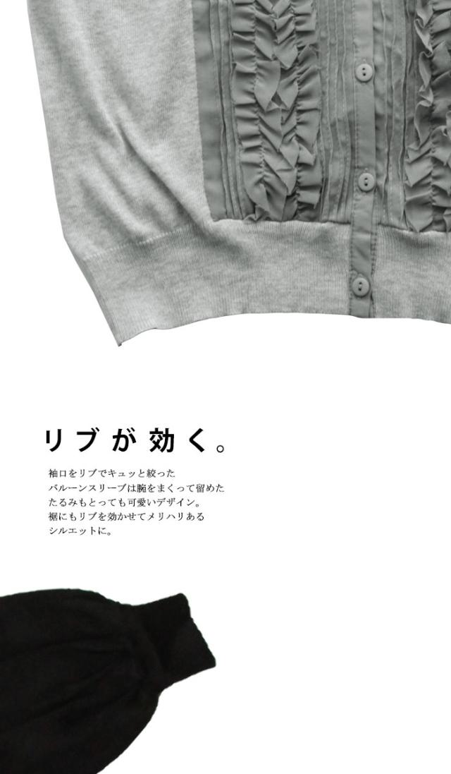 PY-00328 トップス ニット 綿100 羽織り フリル 袖リブ Vネック 前開き 綿ニット 綿 コットン 袖コンシャス バルーンスリーブ 甘辛 フェミニン ニットカーデ カーデ