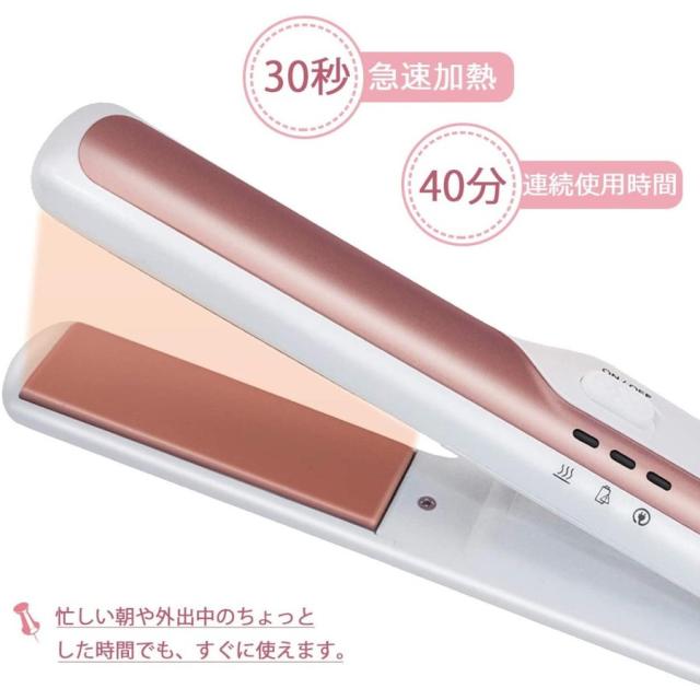 【急速加熱】30秒ぐらいで急速に加熱して使えます。板の表面にはセラミックコーティングがありますので、滑り性、耐久性、熱伝導性に優れています。さらに熱伝導性の高いセラミックプレートの素材で髪のキューティクルを守り、水分バランスを保つことで、髪への損傷を最小限に抑えることができる。忙しい朝でもすぐに理想のスタイリングができます。美容院に行って髪をパーマする時間がない場合やデート前に、使えます。とても便利です。カバーは耐熱性の高いABS樹脂を採用して、火傷を防ぐことができます。