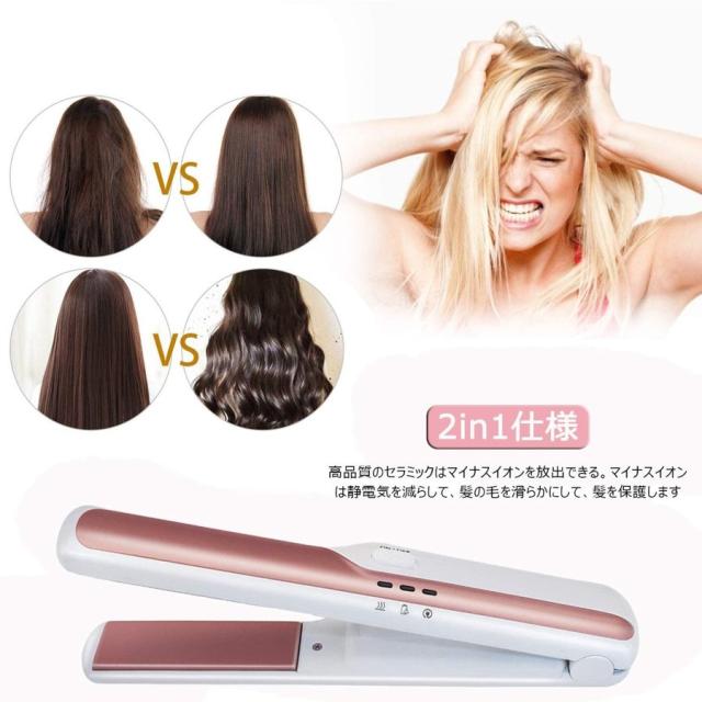 【2in1仕様】カールヘアもストレートヘアも同じくらい楽しみたいという人にはこちらのヘアアイロンがおすすめです。クッションプレートを採用し、プレートがバネのように上下に動くので、髪を強く挟みすぎないようにし、髪が傷つくのを防ぎます。また、その他にもカールヘアがやりやすいというメリットもあります。