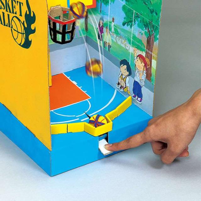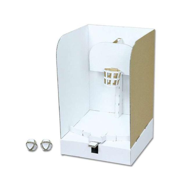 ダンボールバスケクラフトキット。ゴムの力でシュートをうつダンボールバスケをつくろう。対象年齢6歳以上。作成に別途用意するもの:接着剤、絵の具など※商品には付属しません。※画像は着色イメージです。商品は組立が必要です。