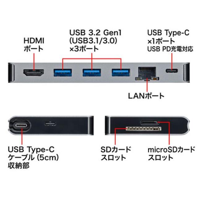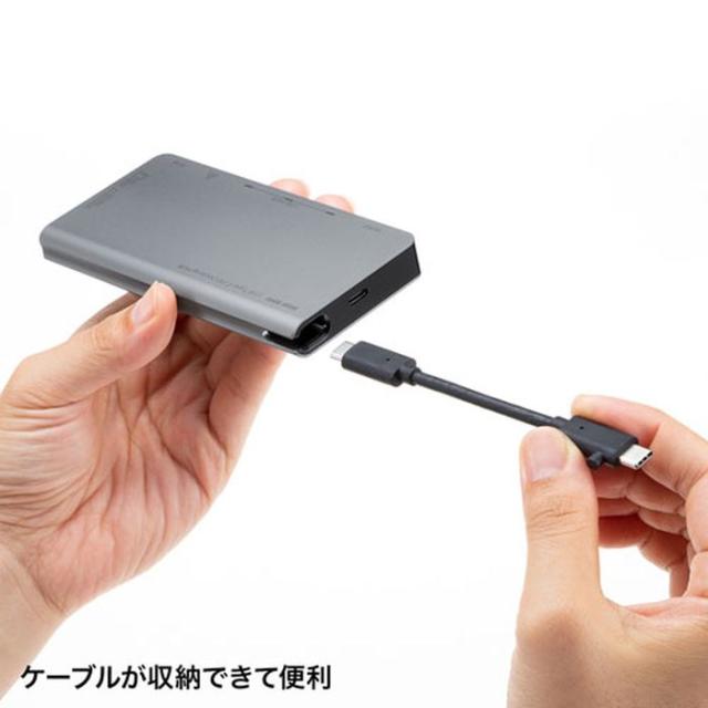 USB Type-Cケーブル1本でHDMIディスプレイ、各種USBデバイス、有線LANの拡張接続ができるUSB Type-Cドッキングハブです。Type-Cケーブル1本の接続で大画面ディスプレイとUSBデバイスで快適に操作し、外出や会議など移動時にはType-Cケーブル1本を抜くだけでさっと持ち運ぶことができます。USB Type-C接続でのHDMIディスプレイ増設「DisplayPort Alternate Mode」に対応するためソフトウェアのインストールなしで簡単にマルチディスプレイ環境(ミラーモード/拡張モード)を実現できます。USB Type-Cでの「USB Power Delivery(USB PD)」に対応しており接続したパソコンへの給電も本製品経由で可能となります。Gigabit Ethernetに対応しているので、Gigabitネットワーク環境にも対応でき、USB Type-Cケーブル1本で有線LAN接続をすることができます。※パソコンとの接続は付属のケーブルを使用してください。SDカード、microSDカードの読み書きができます。収納できるケーブルと据え置き用の30cmケーブル2種類ついており、モバイルでも会社でも便利に使用できます。 <制限事項>※本製品はパソコン本体のType-Cポートに直接接続してください。USBハブ、増設のUSBポートではご利用いただけません。※本製品はUSB PD(Power Delivery)対応ですが、全てのUSB Type-C搭載機器(PD対応)には対応しておりません。※本製品の取り外し、接続に関して、基本的にプラグアンドプレイには対応していますが、まれにUSB認識のタイミングエラーにより正常に表示しない、動作しない場合があります。再度抜き差しをお試しください。これは本製品の不具合、故障ではありません。※本製品はWindows OS、Mac OSが動作している状態で使用するものです。システム起動時や、BIOS画面では動作(表示)しません。※対応機種、対応接続機器・環境の場合であっても正常に動作しないことがあります。※本製品はUSB Type-Cドッキングステーションですが、全てのUSB Type-C機器に接続、動作を保証できるものではありません。