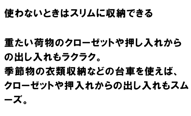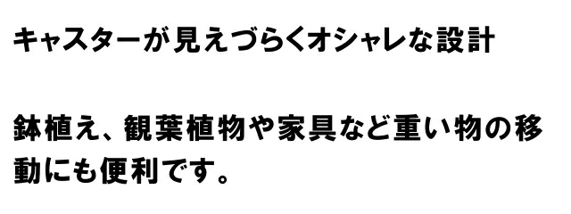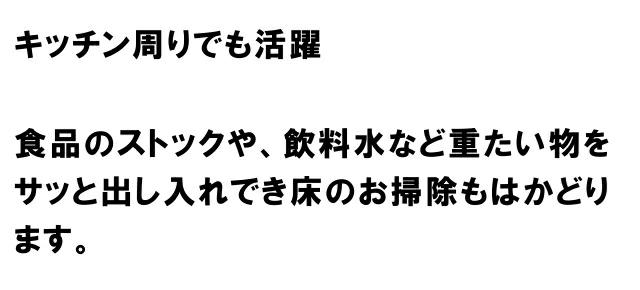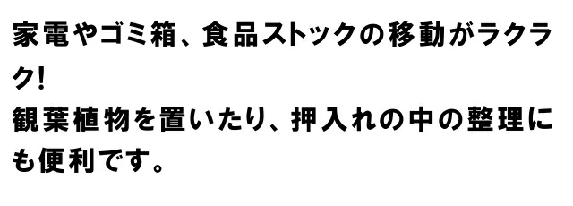家電やゴミ箱、食品ストックの移動がラクラク! 観葉植物を置いたり、押入れの中の整理にも便利です。 |