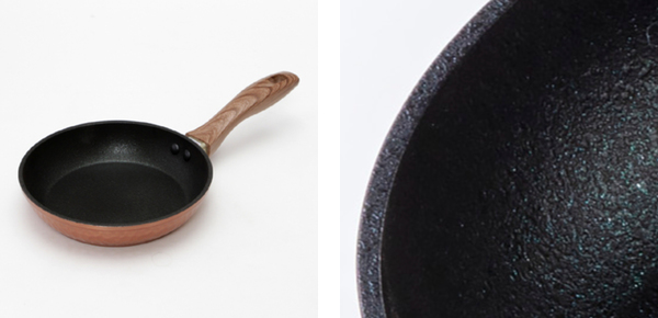 本体の表面は槌目加工で強度があるフライパンです。耐摩耗性テストを100万回クリアしています。厚底で保温性が高く、ムラなく美味しく仕上がります。浅型構造なのでヘラが差し込みやすく、返しやすいです。金属ヘラの使用が可能です。ハンドルは木目調で温かみがあり、手にフィットします。朝食や少量の調理に便利です。