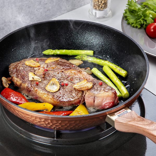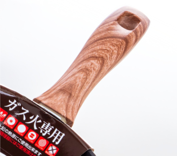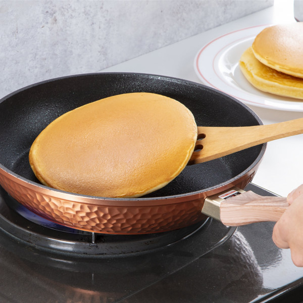 本体の表面は槌目加工で強度があるフライパンです。耐摩耗性テストを100万回クリアしています。厚底で保温性が高く、ムラなく美味しく仕上がります。浅型構造なのでヘラが差し込みやすく、返しやすいです。金属ヘラの使用が可能です。ハンドルは木目調で温かみがあり、手にフィットします。大人数の調理に便利です。