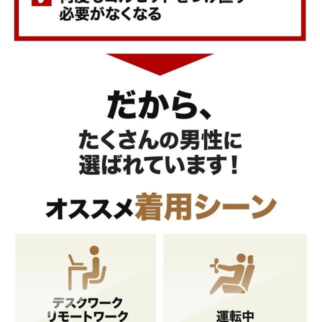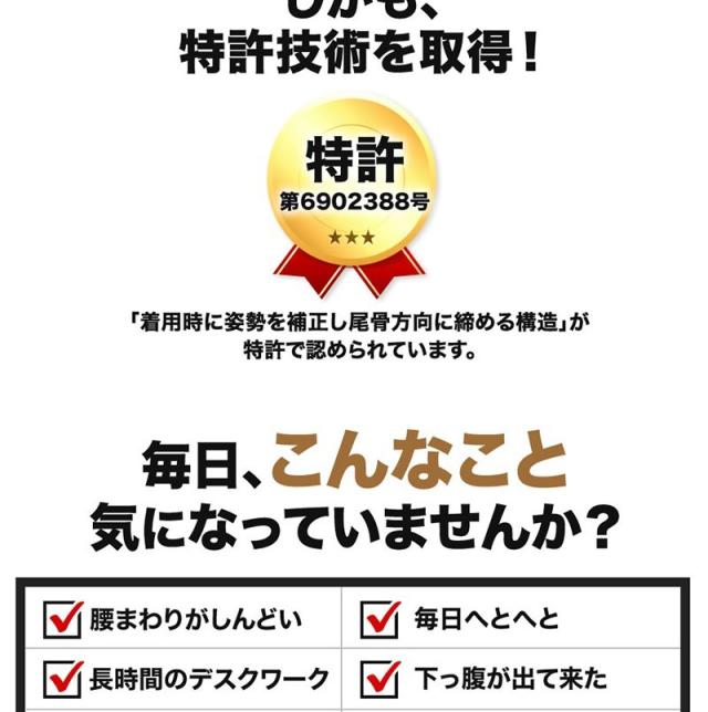 | 適応サイズ | Sサイズ:ウエスト68cm-76cm Mサイズ:ウエスト76cm-84cm Lサイズ:ウエスト84cm-94cm LLサイズ:ウエスト94cm-104cm 3Lサイズ:ウエスト100cm-110cm |
