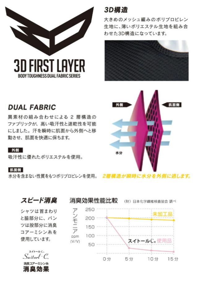 | BODY TOUGHNESS(ボディタフネス)の「BT デュアル3Dファーストレイヤーロングスリーブクルーネックシャツ」です。 シャツやコンプレッションインナーの下に着用する、オールシーズン用の吸汗・速乾・通気性に優れたファーストインナーです。 異素材の組み合わせによる2層構造のファブリックが、汗を瞬時に肌面から外側へ移動させ、肌面を快適に保ちます。臭いの気になる首まわりと脇部分には消臭コアーミシン糸スイトールCを使用しており、悪臭をスピーディーに消臭します(その他の部分にスイトールCは使用しておりません)。 | ||||||