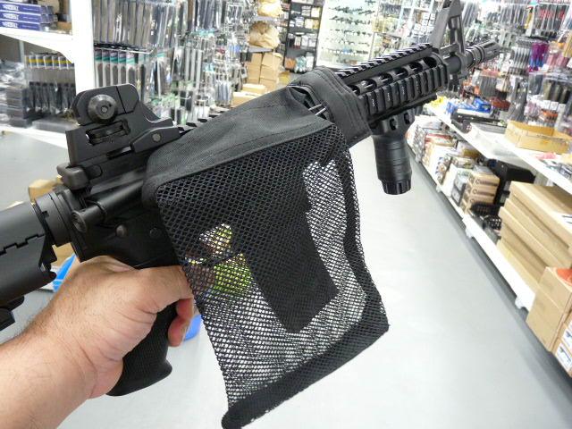 取り付けはベルクロでハンドガード根元に留めて使用する。網袋にはジッパーが付いていて装着状態で排莢されたカートリッジを回収出来る。TOPのM4に便利、またマルゼンのライブショットシェルタイプのM1100やM870にもフィールドで使い時には重宝します。
