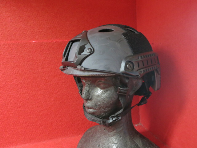 ナイトビジョンゴーグル用マウント付きタクティカルヘルメット。帽体のカラーはタイフーンで新型ブラック迷彩(TYP)とマルチカモカラー(MC)。
