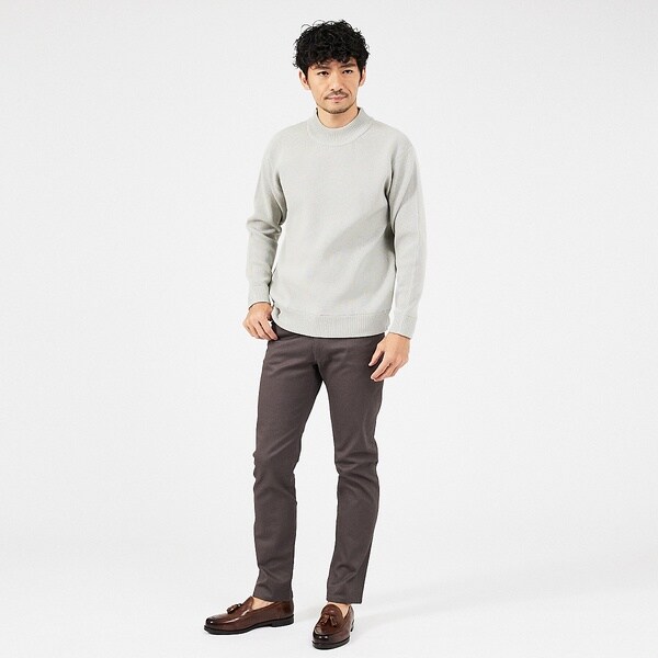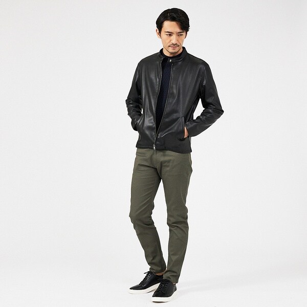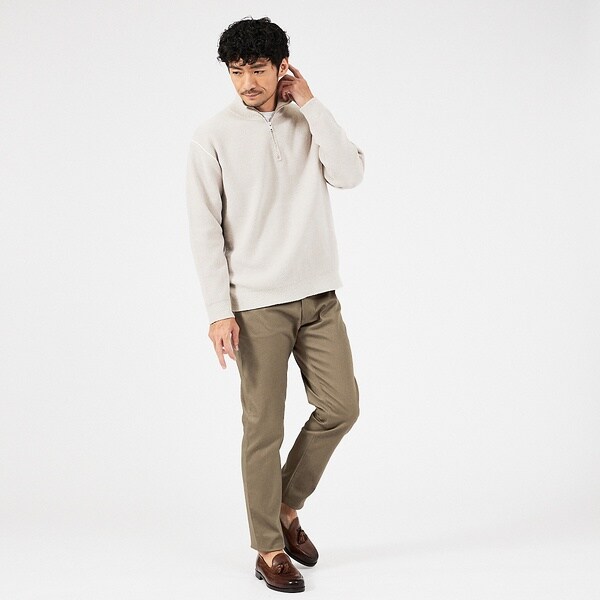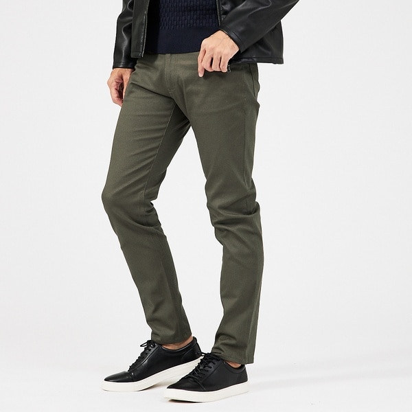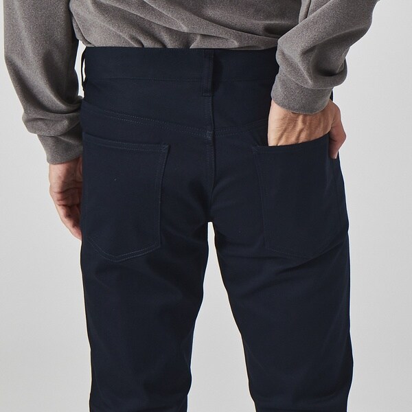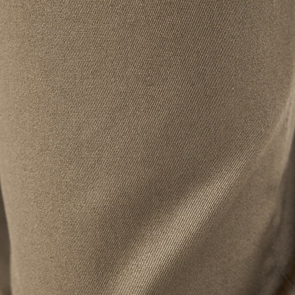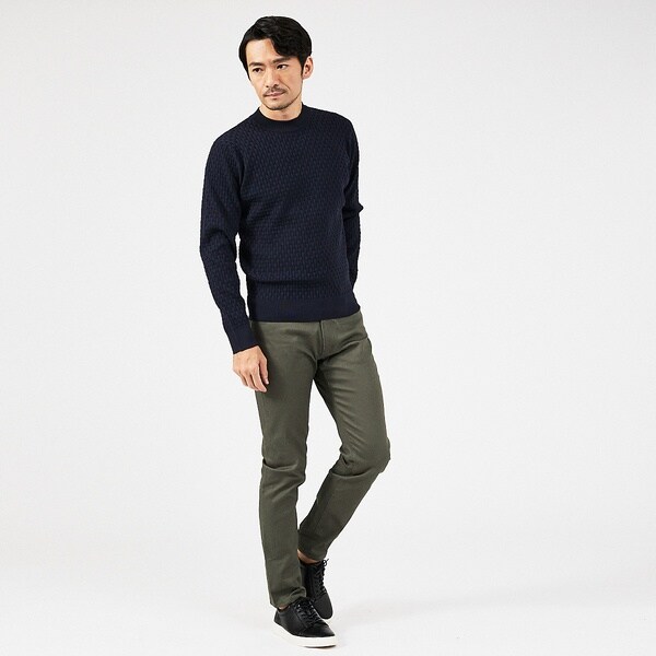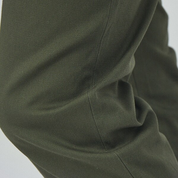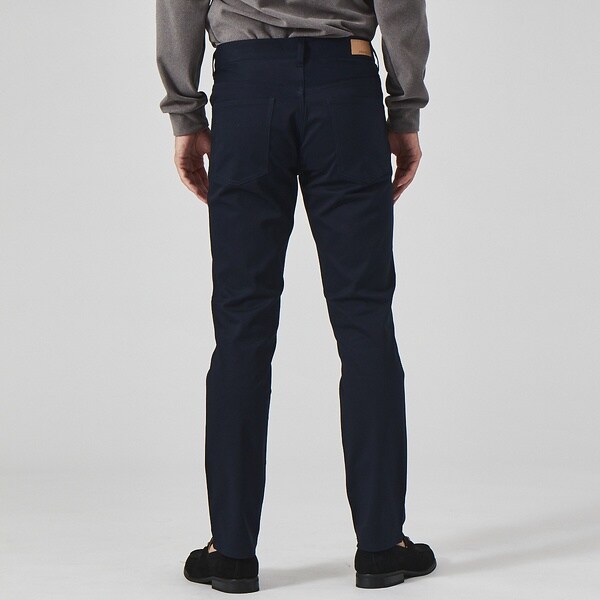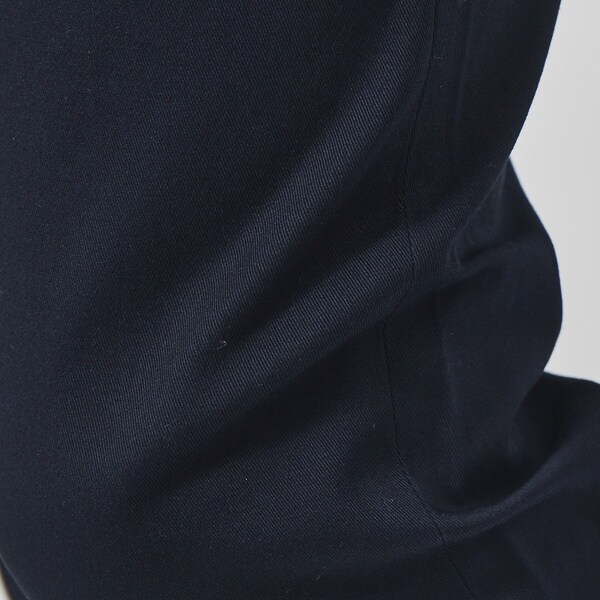 コットンとポリエステルを使用。程よいハリと微光沢がありながらも、ストレッチ性に優れています。細身なシルエットながら窮屈さを感じさせない素材感で、オールシーズン履ける肉感の生地です。
