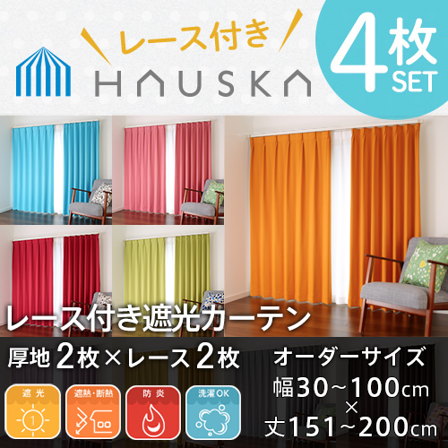 カーテン 遮光 防炎 オーダー 4枚組 全48色 1級遮光 無地 北欧 遮光カーテン 「HAUSKA」 レース付き4枚セット 幅30-100cm 丈151-200cm