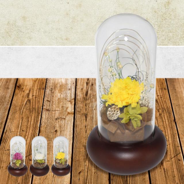 現代建築にも馴染むお供え花です。プリザーブドフラワーの蓮の花をメインで使用。1輪1輪、人の手で開花させた蓮の花を、印象的なたまご型の花器に納めました。内側に貼られた金属箔が光を集めて、まるで中から光を発しているように花を照らします。