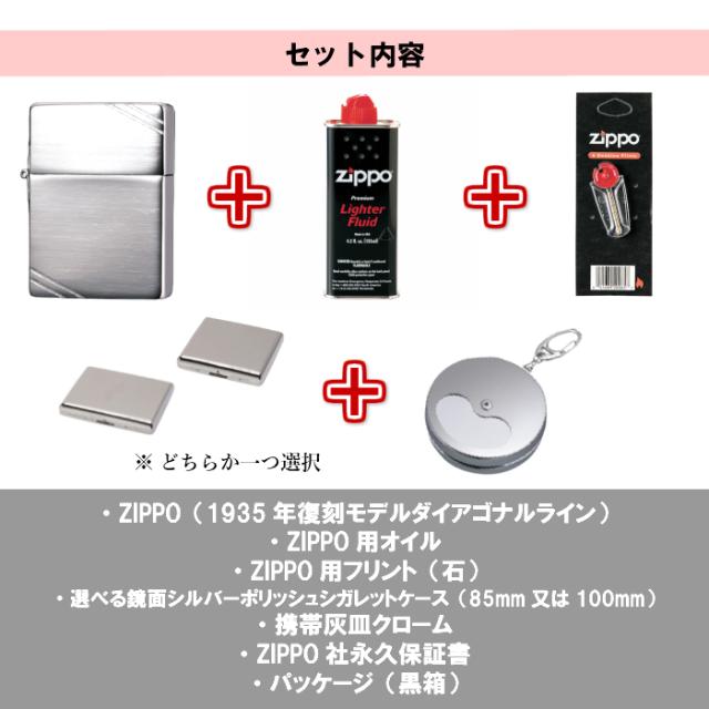 「1935復刻モデルダイアゴナルラインZIPPO フリント、オイル、シガレットケース、携帯灰皿セット」