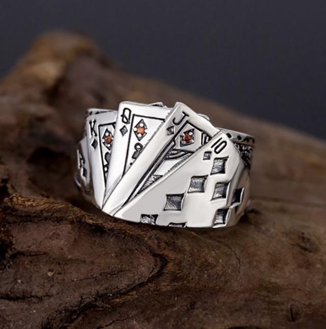 トランプカード をモチーフにした シルバーリング です。ポーカー の ロイヤルストレートフラッシュ の デザインになっていてJ Q K のカードには赤い キュービックジルコニア ( CZダイヤ )が入ってます