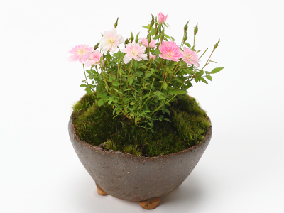 ミニバラよりも小さな品種「姫乙女」。天然苔をあしらったミニ盆栽に仕立てました。