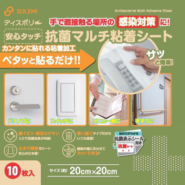 抗菌マルチ粘着シート 10枚入り ディスポリー 安心タッチ ( 抗菌シート 抗菌シール 抗菌テープ 丈夫 カット 使い捨て 銀イオン カテキン ドアノブ スイッチ メニュー表 手すり 受話器 抗菌表示シール付き 日本製 )