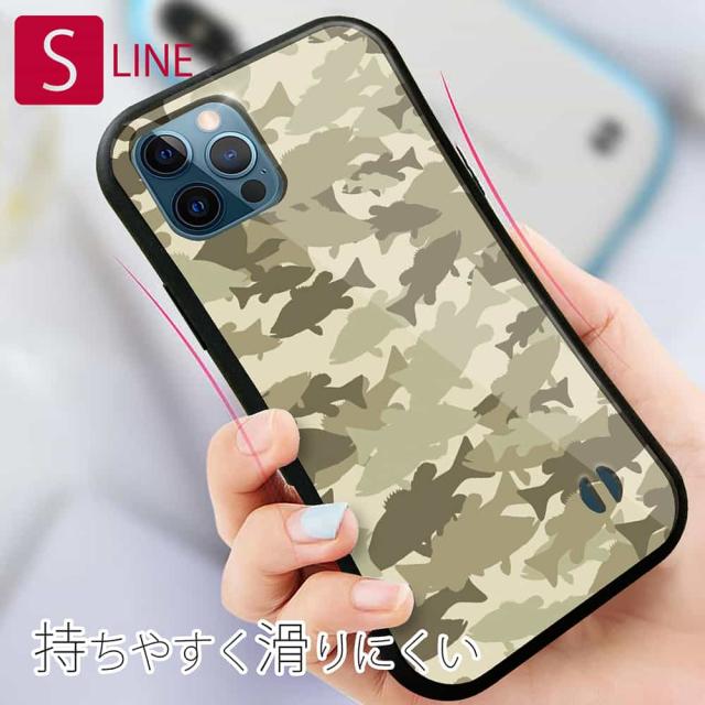 S-LINE ケース iPhone13 mini iPhone13 Pro Max iPhone12 Pro iPhone11 Pro iPhoneXs iPhoneXR Xperia 5 III Xperia 10 III Pixel 5a AQUOS sense6 釣り 魚 ルアー ブラックバス 迷彩大柄 ベージュカラー