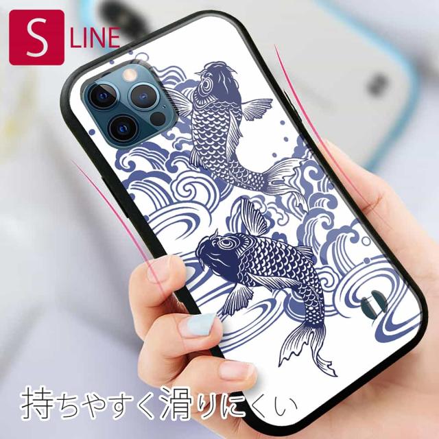 S-LINE ケース iPhone13 mini iPhone13 Pro Max iPhone12 Pro iPhone11 Pro iPhoneXs iPhoneXR Xperia 5 III Xperia 10 III Pixel 5a AQUOS sense6 釣り 魚 ルアー タトゥー風昇り鯉 ブルー&ホワイト