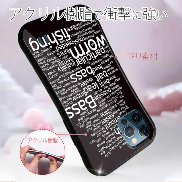 | 商品説明 | 落下や衝撃に強いTPUケース+綺麗に印刷できるアクリル板でプリント。バス釣りで使われる単語やキーワードをタグのようにデザイン。重要単語ほど大きくなっているのだが、なぜワームがこれほどデカイのか? |