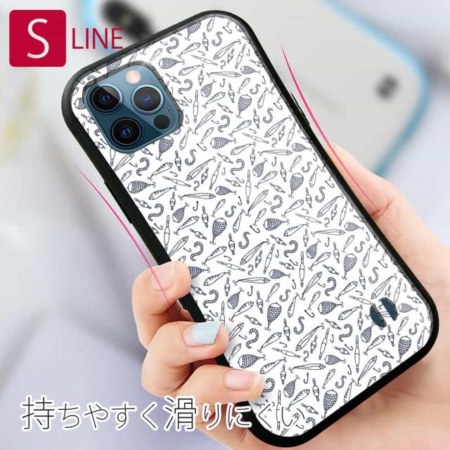 S-LINE ケース iPhone13 mini iPhone13 Pro Max iPhone12 Pro iPhone11 Pro iPhoneXs iPhoneXR Xperia 5 III Xperia 10 III Pixel 5a AQUOS sense6 釣り 魚 ルアー 釣具のシームレスパターン ホワイト
