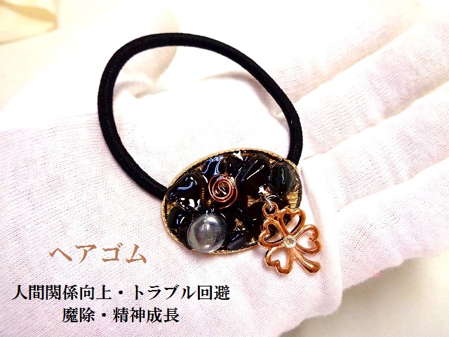 人間関係向上のトラブル回避・魔除・精神成長★オブシディアン★ヘアゴム★クローバー・四つ葉★パワーストーン★護符(霊符)