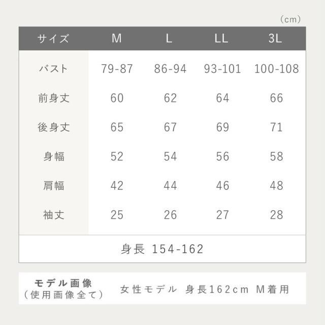■サイズ:身長154-162、M/バスト79-87、前身丈60、後身丈65、身幅52、肩幅42、袖丈25、L/バスト86-94、前身丈62、後身丈67、身幅54、肩幅44、袖丈26、LL/バスト93-101、前身丈64、後身丈69、身幅56、肩幅46、袖丈27、3L/バスト100-108、前身丈66、後身丈71、身幅58、肩幅48、袖丈28cm。モデル/身長162cm、Mサイズ着用。