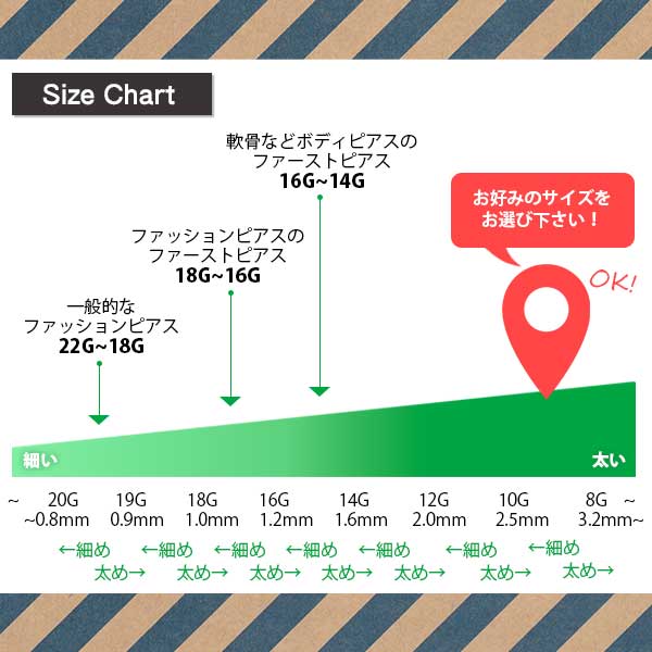す。 サイズに幅があると完成前のピアスホールの場合、中途半端なサイズになるというご意見がありましたため、当店ではさらに厳しくサイズチェックの改善を行なっております。 また、先端のでっぱりや曲がりなども厳しくチェックし、するんと滑らかなものだけを厳選しております。 ルチアは一番満足してもらえるショップでありたいと考えて運営を行なっております。 自信を持ってお勧めしております。 |
