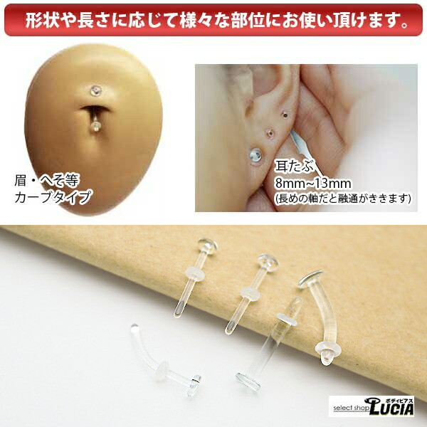 カーブドバーベル(バナナバーベル)はおへそやボディ向け、軟骨をCBR等のリング型で安定させた方にお勧めします。