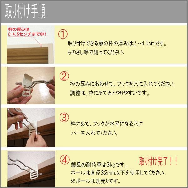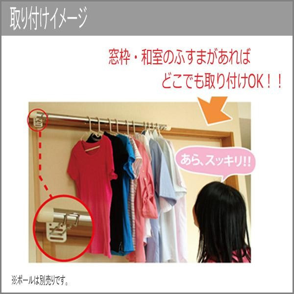 商品詳細:室内の敷居に引っ掛けて使用する物干し竿掛けです。取付けはワンタッチでとても簡単、ネジや釘・接着剤を使用しません。賃貸にお住まいの方や家にネジ穴を付けたくない方には、お勧めです!2つ使用するとポールをかける事ができます。(本品は1個入となります。) 生産国:中国 素材・材質:本体:鉄線(クロームメッキ(キズ防止樹脂付))座金:鉄(塗装) 仕様:耐荷重(1個あたり):3kg取付け可能な枠の厚み:2~4.5cm適応ポール径:直径32mm以下