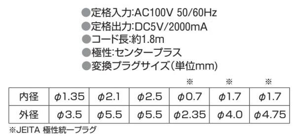 商品詳細:家庭用コンセント(AC100V)をDC5Vの電圧に変換することができます。安定化回路内蔵で、電圧変動が少なく機器にやさしい。スイッチング式。 生産国:中国