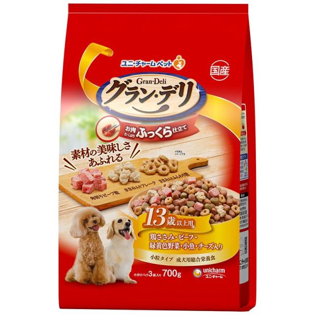 (まとめ買い)ユニ・チャーム グラン・デリ ふっくら仕立て 13歳以上用 鶏ささみ・ビーフ・緑黄色野菜・小魚・チーズ・角切りビーフ粒入り 700g 犬用フード 〔×4〕 【北海道・沖縄・離島配送不可】