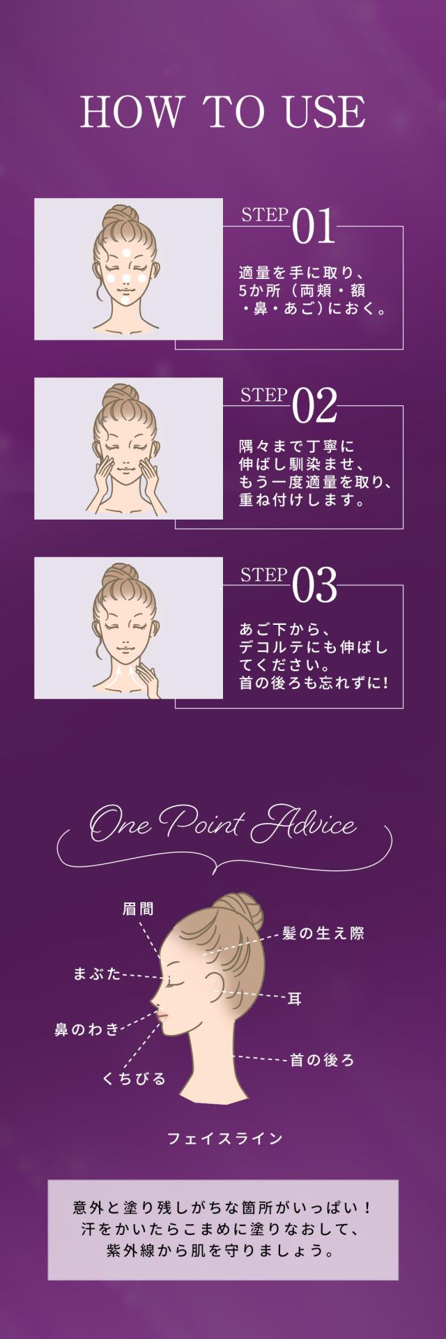 化粧水・乳液等でスキンケアをし、肌を整えたあと適量を手に取り塗布してください。