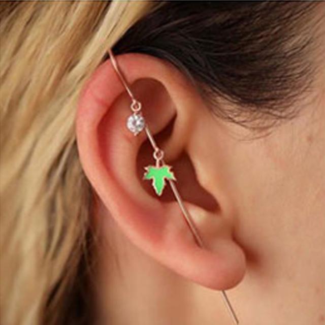 グリーンガンジャクリスタルチャーム ステッキイヤーカフ 1個販売 イヤーフック メンズ レディース 女 イヤーラップ インダストリアル おしゃれ ゴールド 金色 プレゼント 結婚式 ロング 杖 20G 20ゲージ ジュエル 1粒 緑色 葉 ジルコニア 揺れる リーフ マリファナ メープル