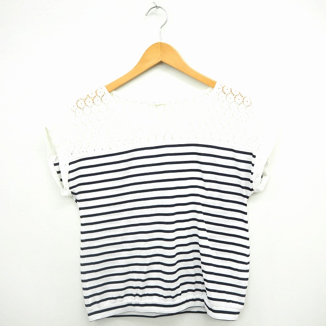 【中古】ロペピクニック ROPE Picnic シャツ ブラウス ボーダー レース 丸首 半袖 コットン 綿 38 ネイビー ホワイト