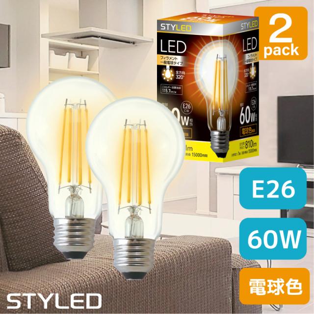【2個セット・1個当たり549円】LED電球 クリア電球 E26口金 60W相当 ・810ルーメン・全方向タイプ・電球色 一般電球形 フィラメント クリア 電球タイプ STYLED(スタイルド)HDAC60L1X2